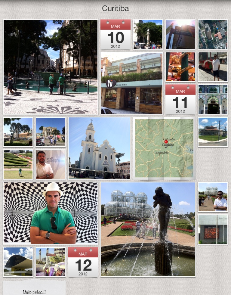 Dá uma olhada na montagem (resume bem a viagem) de fotos de Curitiba que eu fiz usando o iPhoto para o iPad. (custa U$ 4 na App Store)