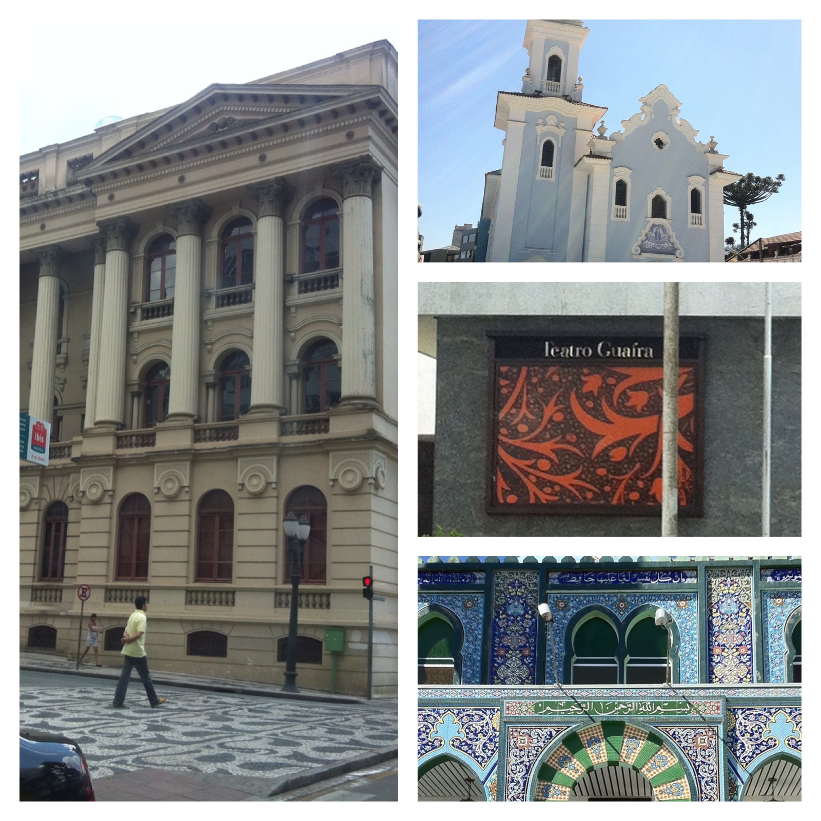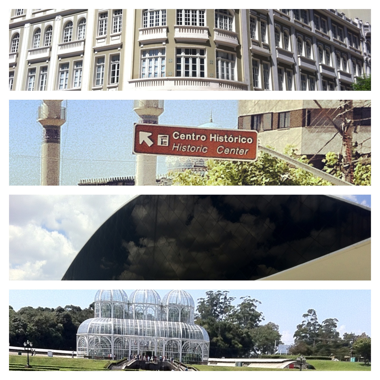 Em sentido horário, prédio histórico da UFPR, igreja católica no Largo da Ordem, detalhe do Teatro Guaíra, e detalhe da Mesquita Islâmica no Largo da Ordem.