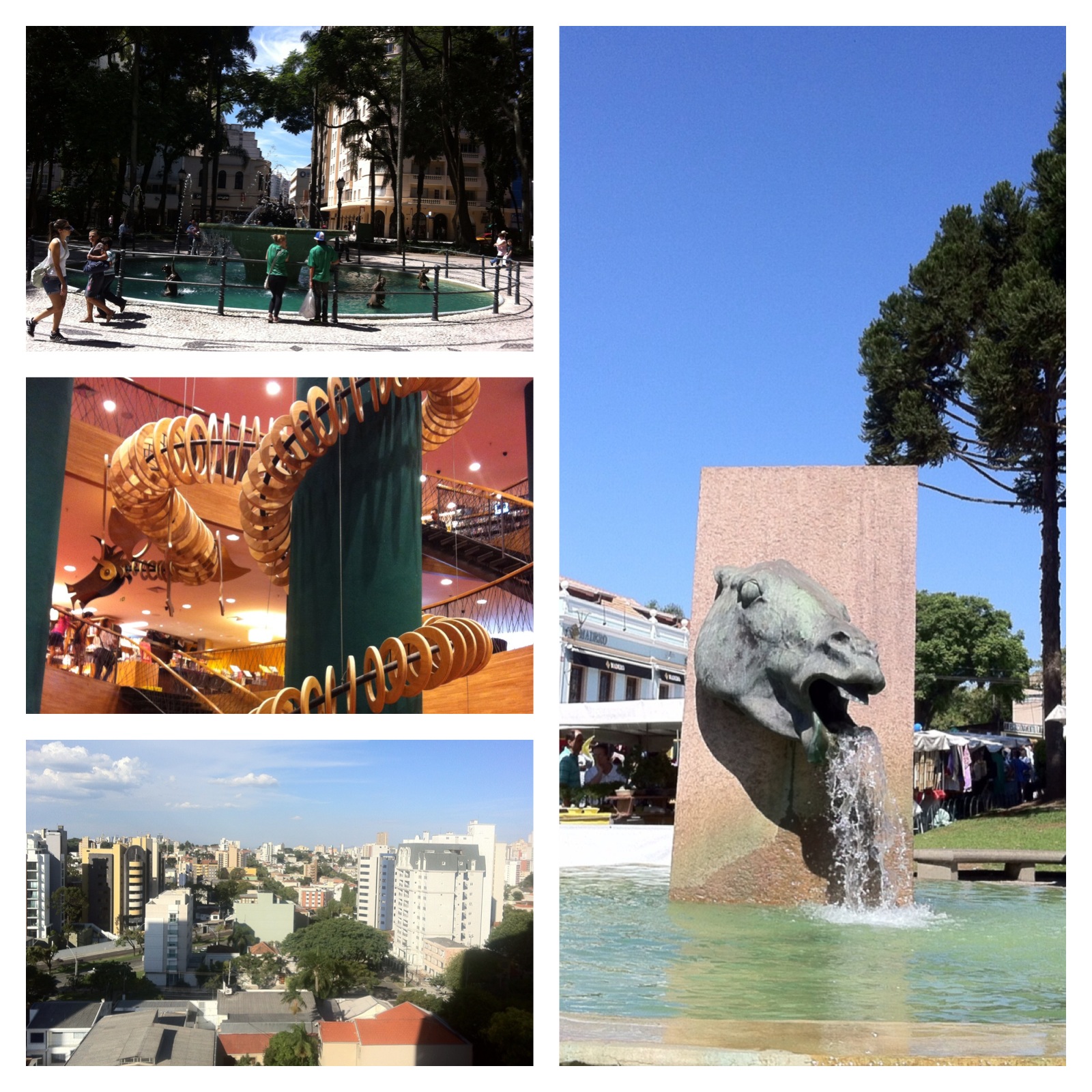 Agora no sentido anti-horário, praça central no Largo da Ordem, chafariz da XV, dragão da Livraria Cultura e panorâmica de Curitiba desde o Bigorrilho.