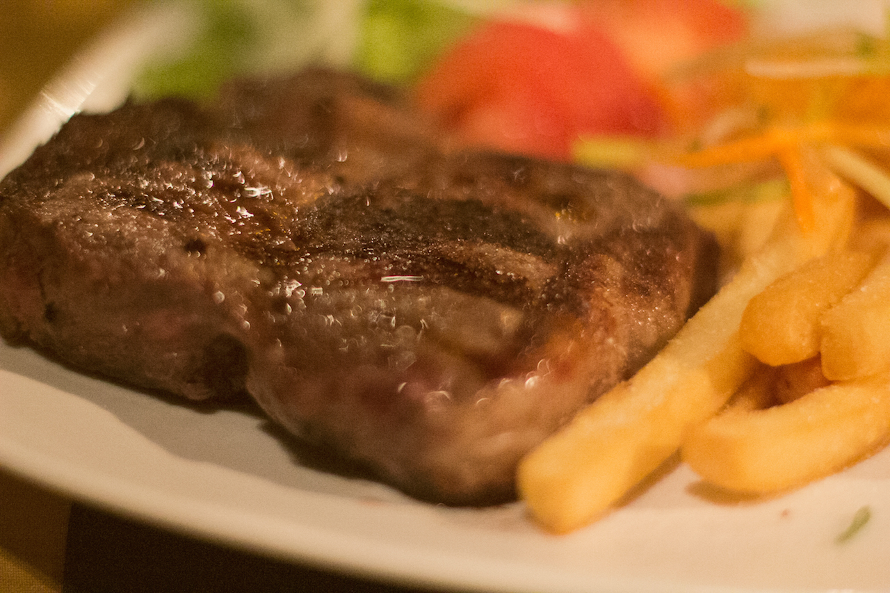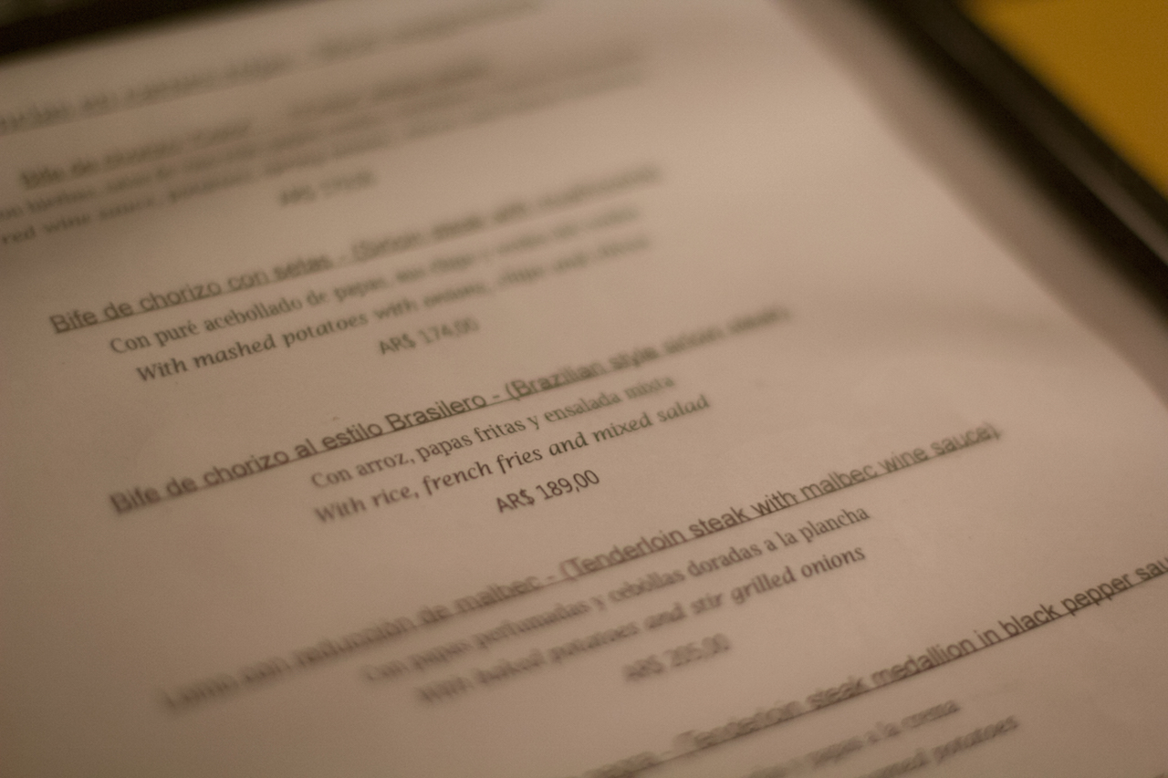O cardápio é bem mesclado tem massas, pizza e churrasco. Este último é o que eles sabem fazer de melhor e foi o meu pedido: Bife de Chorizo à borboleta no estilo brasileiro. Eu sempre peço assim, pq para quem não sabe o Bife de Chorizo é um corte alto de carne e o ponto do churrasqueiro é o antes do ponto do brasileiro. Este prato custa P$ 189 algo em torno de R$ 58.