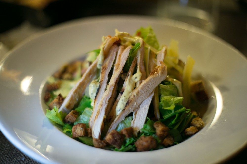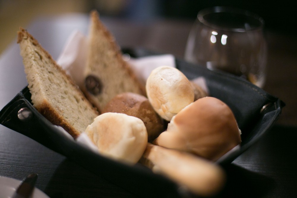 A sequência de pratos: de entrada, uns pãezinhos com manteiga, salada caesar, e o prato principal a especialidade da casa, bife de chorizo com acompanhamento risoto com mostarda. A nossa conta deu basicamente R$ 230.