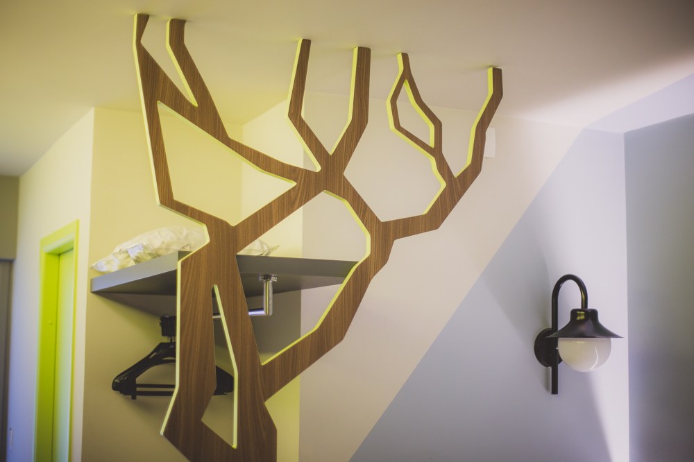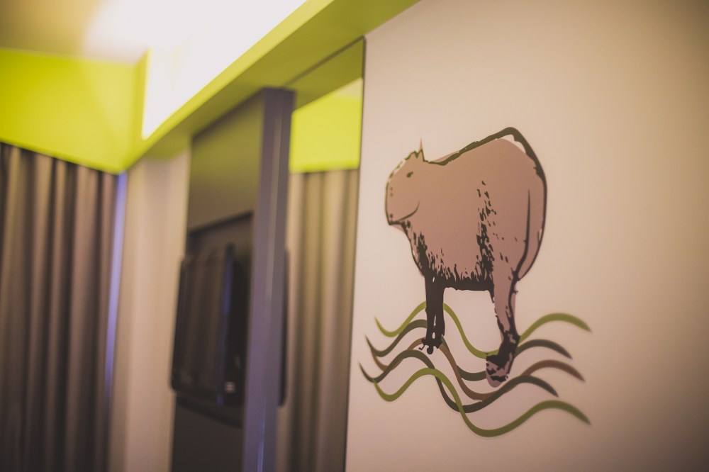 O tema do hotel é “Parques de Curitiba”, assim, cada andar recebe um tema, o meu andar era o Parque Tingui, então no meu quarto havia uma simpática Capivara.