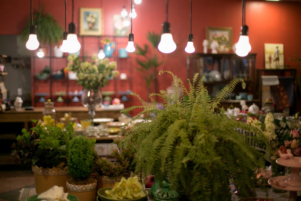 O ambiente é uma mistura de loja de decoração com café, perfeito para um chá da tarde.